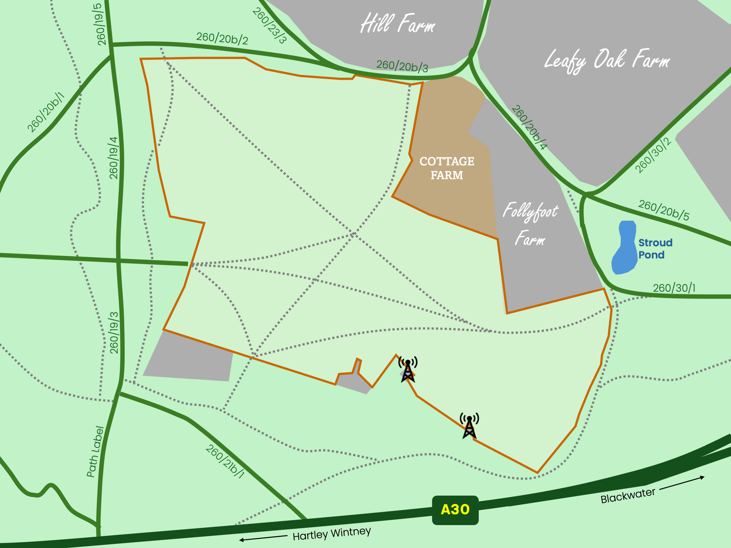 Cottage Farm fields were opened to the public in August 2025 as part of a Common Land exchange with Blackbushe Airport. The fields are managed by contractors on behalf of the landowner, Cottage Farm Holding Ltd, and are maintained in accordance with an Environmental Management Plan.